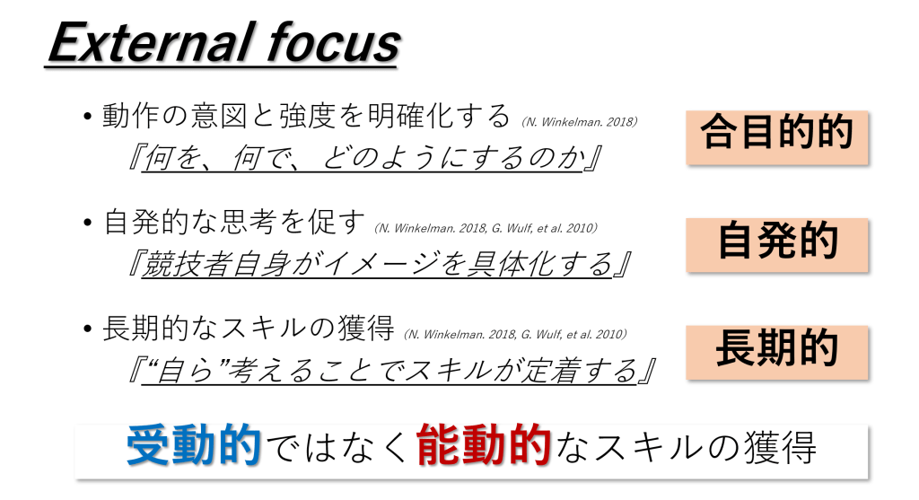 外的集中によって動作目標(ゴール, 結果)をはっきりと示し、「なぜをそれをやるのか」という動作の意図に合ったスキル習得を促す。また、結果からそこに至るプロセスを、実践者自身が体現することで自発的な思考を促進させ、そこで得たスキル習得の効果は、より長い期間持続すると考えられています(1,2,3)。