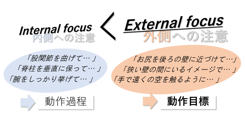 運動指導において、指導者の“声かけ”は実践者にとって重要な外部情報の1つです。その中でも、身体の外部や全体像をイメージさせるような「External focus: 外的集中」を促す“声かけ”によって、スキルの習得をより確実にすることができます。