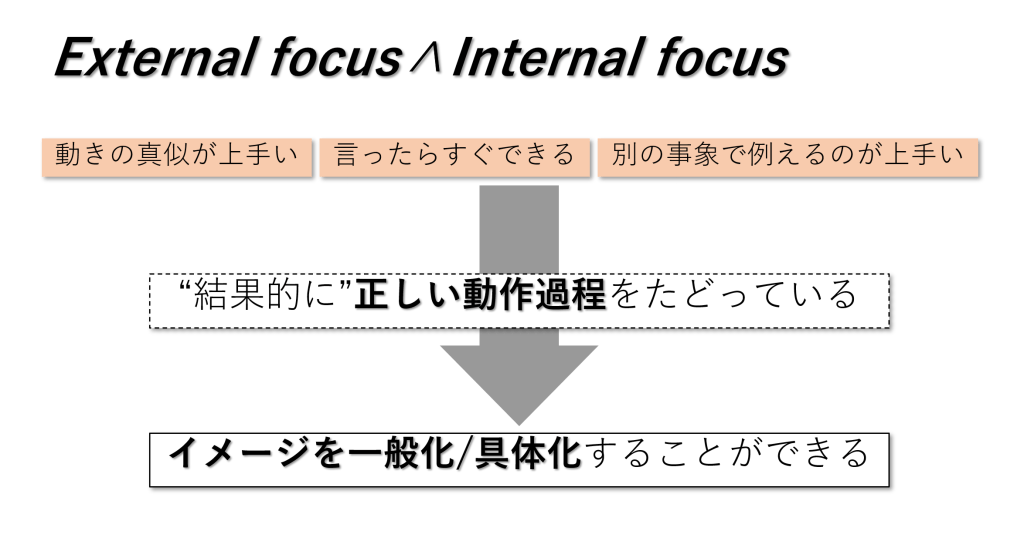 この、“トップダウン”による身体運動の表現においては、目指した外部イメージだけでなく、内部の動作過程(「股関節を深く曲げて、膝を高く上げて」など=Internal)も“結果的に”正しいプロセスを踏んでいることが多いです。聴覚情報に限らず、視覚的にとらえた情報を具体化できる人や、別の動きに当てはめることができる人もそうでしょう。