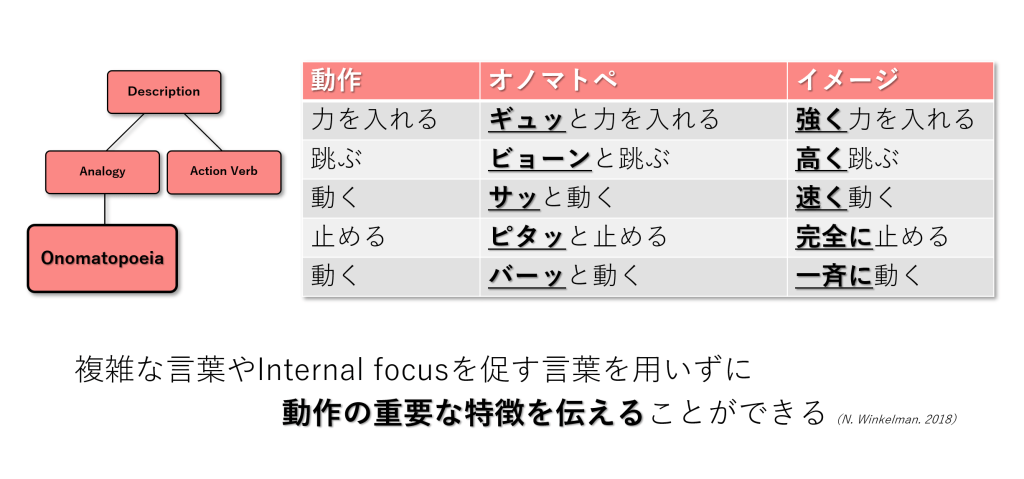 指導者としても、これだけオノマトペを多用すると「面白い」とも思ってしまいますが、それと同時に「しっくりくる」感覚があるのは確かです。対象や運動を適切に理解し、その層に合った比喩表現を用いることは、スキル習得を促進するために必要な技術の1つであることは間違いありません。