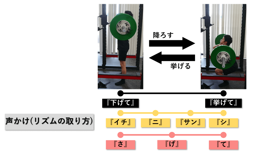 「4カウントで降ろして」、「4カウントで挙げる」というように、数を数えて4点でリズムを取る、もしくは動作を表す動詞でカウントを取るようにして(『さ・げ・て』など)3点でリズムを取るような方法は、聞き手に「リズム」を認識させやすい声かけと言えます。