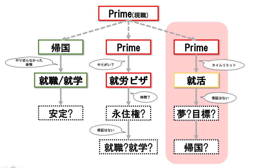 自分に時間の余裕を与えれば、ここまで悩むことではないのかもしれませんが、ビザの状況、年齢、キャリア、理想と現実のギャップ…色んなことを考えると、中々ここからどう動くことが最善なのかが見えていない、というのが正直なところです。